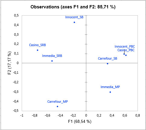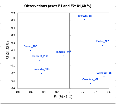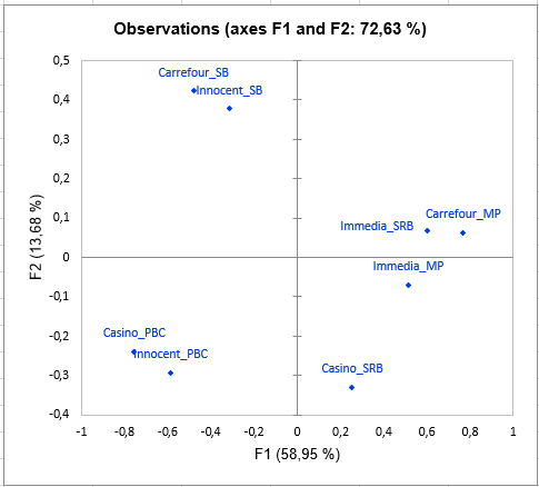 Then comes the analysis of each of the classes built. The representation of the objects (smoothies here) in each class shows differences in perception between the classes of subjects, especially concerning the smoothie Carrefour_SB. Indeed, the latter is placed with the smoothie Innocent_SB by the subjects in class 1, with Innocent_PBC and Casino_PBC by the subjects in class 2, and with Carrefour_MP by those in class 3.