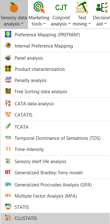 Select the XLSTAT / Advanced features/ Sensory data analysis/ CLUSTATIS command (see below).