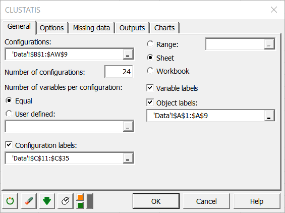In the General tab, select the data on the Excel sheet of the demo file that corresponds to the configurations (a configuration corresponds here to the set of coordinates given by a subject). The number of configurations must then be entered. Herein, there are 24 contiguous tables corresponding to the 24 subjects.