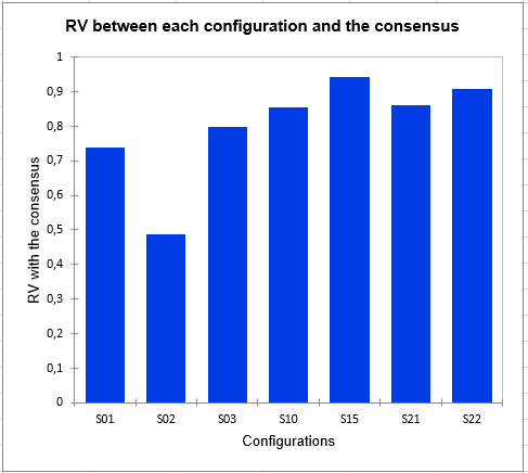 The following graph gives indications on the proximity of the configurations and the consensus of the class in which they are placed. These proximities are represented by the RV coefficient, which is an index of similarity between 0 and 1. In class 2, we can observe that subject 2 is much further from the consensus than the others, which means that it does not conform well to the class. His perception is different from all the classes (since he has been placed in the class that most correspond him by the algorithm). This kind of problem can be solved by adding the "K+1" class in the Options tab, which is an additional class designed to set aside atypical configurations.
