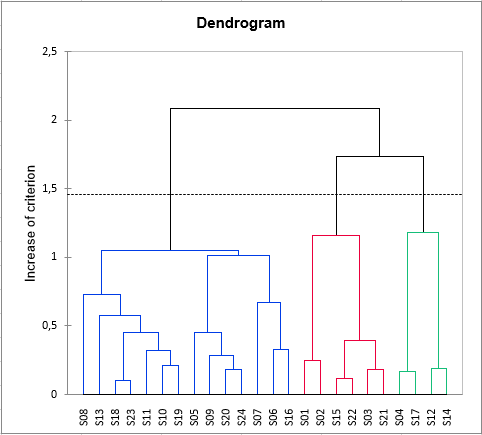 The chart below is the dendrogram. It represents how the algorithm works to group the configurations, then the groups of configurations. As you can see, the algorithm has successfully grouped all the configurations. The dotted line represents the automatic truncation, leading to three groups.