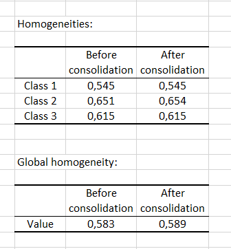 Finally, the homogeneity indexes of each class allow to assess the quality of the cluster analysis. The closer these indices are to 1, the more homogeneous the classes are. Here we see that class 1 is a little less homogeneous than the others. The global homogeneity, which is a weighted average of the homogeneity of each class, is rather correct. However, it could be improved with the addition of a "K+1" class.