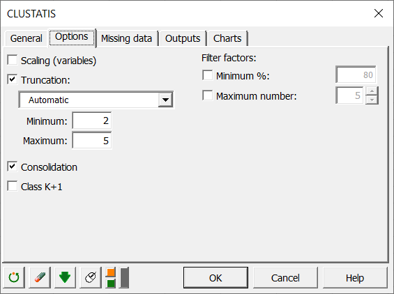 In the Options tab, we chose to not reduce the variables, since within each configuration, all variables are on the same scale. We decided to leave the choice of the number of classes automatic, and to apply a consolidation of the classes obtained by the hierarchical algorithm in order to obtain a more precise cluster analysis.
