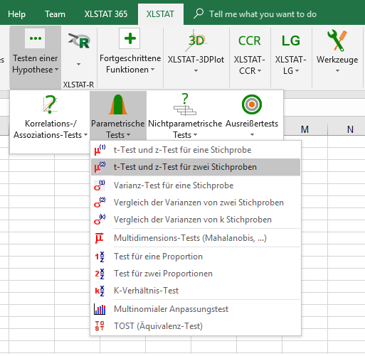 Nach dem Öffnen von XLSTAT, wählen Sie den Befehl XLSTAT/Parametrische Tests /Zwei-Stichproben t-Test oder klicken Sie auf den entsprechenden Button in der Toolbar "Parametrische Tests" (siehe unten).
