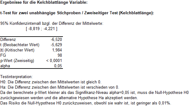 Der Unterschied scheint sehr signifikant für die Kelchblattlänge zu sein.