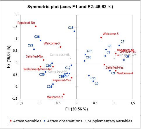 Die Daten entsprechen einer Umfrage eines Autoverkäufers, bei der 28 Kunden jeweils 5 Fragen beantworteten eine Woche nach der Abholung Ihres Wagens nach einer mechanischen Reparatur. Die Fragen waren: - Sind Sie generell zufrieden mit dem Service? (Ja/Nein) - Sehen Sie das Problem als behoben an? (Ja/Nein/Unklar) - Wie beurteilen Sie die Begrüßung? (1 bis 5) - Ist das Qualität-Preisverhältnis zufriedenstellend? (Ja/Nein) - Werden Sie erneut unser Kunde sein? (Ja/Nein/Unklar) Durch eine multiple Korresponzanalyse (MKA) wird versucht die Beziehungen zwischen den verschiedenen möglichen Antworten der Fragen zu identifizieren.