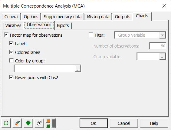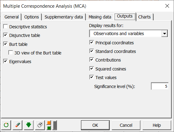 Anschließend werden die Koordinaten der Kategorien im Faktorraum angezeigt (die verschiedenen Kategorien der ausgewählten qualitativen Variablen). Die Ergebnisse, die die Kategorien der zusätzlichen Variablen betreffen werden in blau angezeigt. Die Koordinaten der Individuen werden weiter unten angezeigt. Die Beiträge, die Quadrate der Kosinuswerte und die Testwerte stellen die Ergebnisse dar, die während der Interpretation der graphischen Darstellungen zu benutzen sind: Vor der Interpretation der Proximität zwischen zwei Kategorien und/oder Beobachtungen, muss man überprüfen, ob es sich nicht um einen Projektionseffekt handelt. Dazu kann man überprüfen, ob die Kosinuswerte oder die Beiträge für betroffenen Achsen und die betroffenen Kategorien/Beobachtungen.