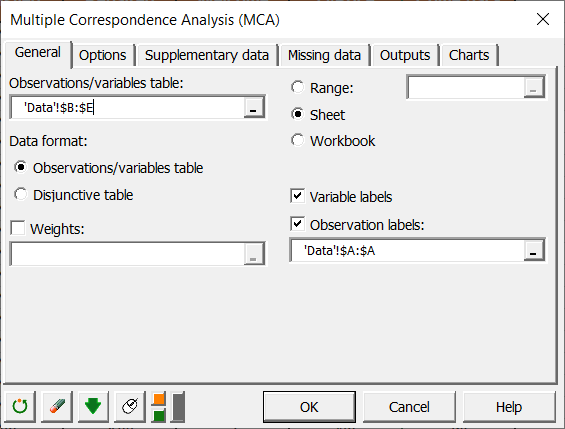 Nachdem auf den Button geklickt wurde, erscheint das Dialogfenster der multiplen Korrespondenznanlyse. Die „Daten“ entsprechen hier einer Beobachtungen/Variablen-Tabelle. Die “Beschriftungen der Beobachtungen” werden im entsprechenden Feld ausgewählt und die Option “Variablenbeschriftungen” bleibt aktiviert, da die erste Zeile der Tabelle die Namen der Variablen enthält.
