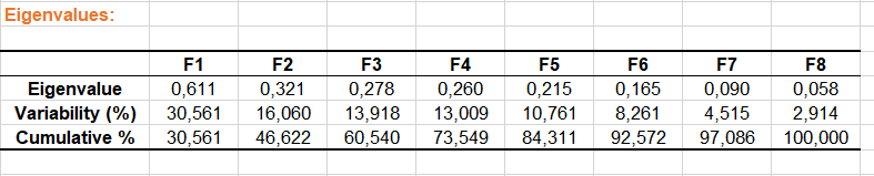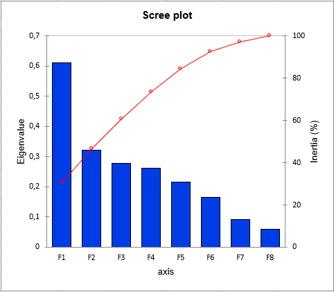 In der darauf folgendenden Tabelle werden die Eigenwerte ungleich Null und die entsprechenden Prozentsätzer der Trägheit angezeigt. Im Gegensatz zur Korrespondenzanalyse (KA) sind die Prozentsätze nicht interpretierbar in Hinblick auf die Qualität der Repräsentation, einzig wichtiges Element für den Benutzer der Methode. Greenacre et al (2005) schlagen den Gebrauch einer angepassten Trägheit von, die näher an der Wirklichkeit ist. Wenn die klassische Berechnung ein Ergebnis von lediglich 46,6% mit den beiden ersten Achsen ergibt, so sieht im hier, dass die Methode der angepassten Trägheit hier 87,3% ergibt.