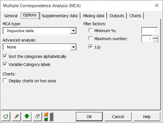 Die Option 1/p wird ausgewählt, um die Faktoren, die nur wenig Information leisten herauszufiltern. So werden alle Ergebnisse die die Faktoren betreffen, deren Eigenwert kleiner als 1/p ist, (wobei p die Anzahl der qualitativen aktiven ausgewählten Variablen ist) nicht angezeigt.