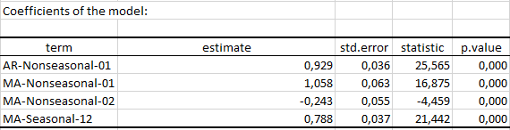 The following table represents the chosen model parameters for the procedure. Here, the X-13ARIMA-SEATS procedure retained the following model (p=1 d=1 q=2) (P=0 D=1 Q=1).