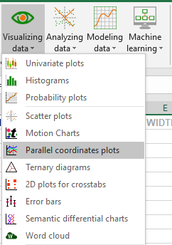 Nach dem Öffnen von XLSTAT, wählen Sie den Befehl XLSTAT / Visualisierung der Daten / Parallele Koordinaten oder klicken Sie auf den entsprechenden Button in der Toolbar "Visualisierung der Daten" (siehe unten).