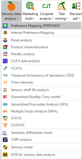 Um das Präferenz-Mapping zu starten, starten Sie XLSTAT, dann wählen Sie XLSTAT/ Sensorielle analyse /Preference Mapping oder Klicken auf den entsprechenden Button des Sensorielle analyse Balkens (siehe unten).