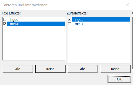 Nach dem Klicken auf den OK Button, wird ein Dialogfenster zur Auswahl der Faktoren die im Modell zu berücksichtigen sind angezeigt. Der fixe Effekt ist das Metall und der zufällige Effekt ist die Legierung.
