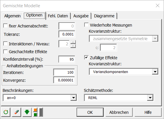 Die Modellparameter werden mittels der beschränkten Methode der maximalen Wahrscheinlichkeit (REML) ermittelt und sind unterschiedlich im Vergleich zu einer klassischen ANOVA. Alle Indizes werden benutzt, um Modelle mit verschiedener Kovarianzstruktur zu vergleichen.