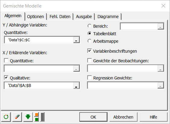 Nach dem Klicken des Buttons, erscheint das Dialogfenster. Wählen Sie nun die Daten, die den zu berücksichtigenden Variablen entsprechen auf dem Excel-Blatt aus. Die „abhängige Variable“ (oder zu modellierende Variable) ist hier die Spalte „Druck“. Unser Ziel ist es den Effekt der Legierung, und des Barren auf die Variabilität des Drucks zu bestimmen. Da die Spaltennamen für die Variablen ausgewählt wurden, aktivieren Sie bitte die Option „Beschriftung der Variablen“. Wählen Sie anschließend die wiederholten und Subjektfaktoren als erklärende Variablen.