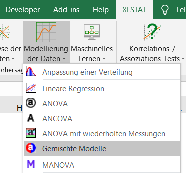 Nach dem Start von XLSTAT wählen Sie den XLSTAT/Modellierung der Daten/Gemischte Modelle Befehl oder klicken Sie auf den zugehörigen Button in der "Modellierung der Daten" Toolbar (siehe unten).
