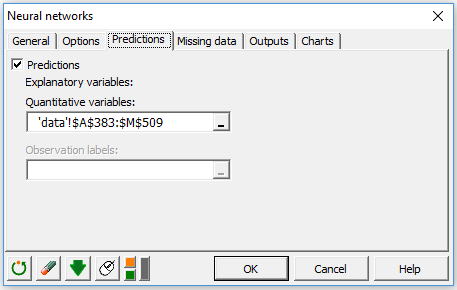 In the Predictions tab, select the range A383 :M509 in the Explanatory Quantitative variables field. These observations come from the test data.