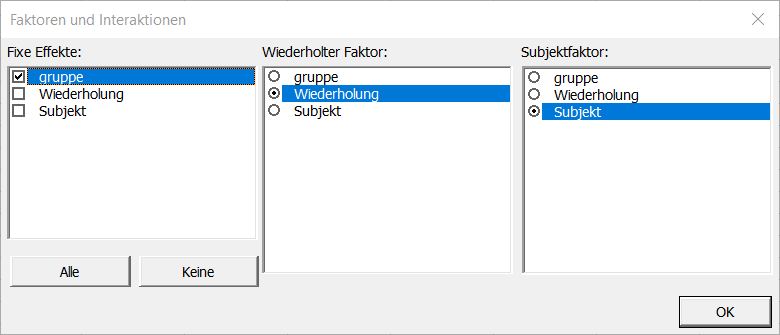 Sobald Sie auf die Schaltfläche OK klicken, erscheint ein Dialogfenster, in dem Sie wählen können, welche Faktoren im Modell berücksichtigt werden müssen. Der fixe Effekt ist "Gruppe", der wiederholte Faktor ist "Wiederholung", und der Subjektfaktor ist "Subjekt" (diese Faktoren werden automatisch erzeugt).