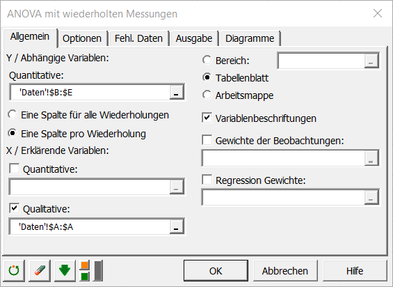 Durch Anklicken der Schaltfläche wird das Dialogfenster "ANOVA mit wiederholten Messungen" angezeigt. Wählen Sie die Daten in der Excel-Tabelle aus.