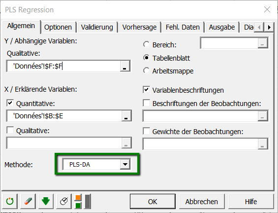 Nach dem Klicken des Buttons, erscheint das Dialogfenster der Partial Least Squares regression.