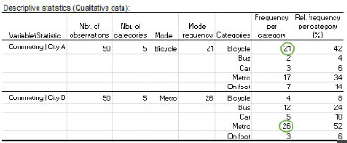 - Der Modus und die Modusfrequenz: Das Fahrrad wird von Personen bevorzugt, die in der Stadt A (Modusfrequenz = 21) leben, während die U-Bahn der beliebteste Pendelmodus für die Bewohner der Stadt B ist (Modusfrequenz = 26).