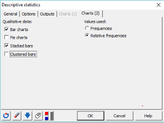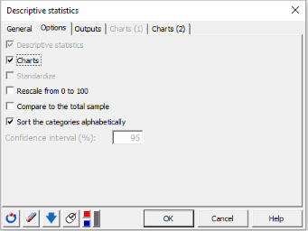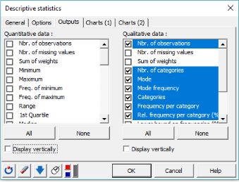 5. Wählen Sie in der Registerkarte Ergebnisse die folgenden Statistiken aus: Anzahl der Beobachtungen, Anzahl der Kategorien, Modus, Modusfrequenz, Kategorien, Häufigkeit pro Kategorie und rel. Häufigkeit pro Kategorie (%).