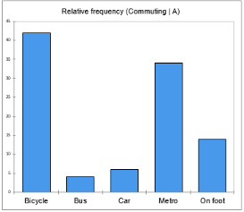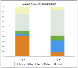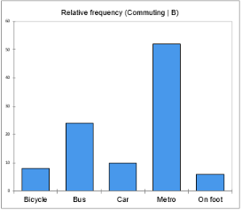 Aus dem ersten Diagramm können wir leicht bestätigen, dass Fahrrad die häufigste Ausprägung von Stadt A ist, wobei mindestens 40% der Befragten diese Form des Pendelns wählen. Personen aus der Stadt B scheinen die öffentlichen Verkehrsmittel zu bevorzugen, da die Bars der U-Bahn und des Busses eine relative Häufigkeit von mehr als 70% aufweisen.