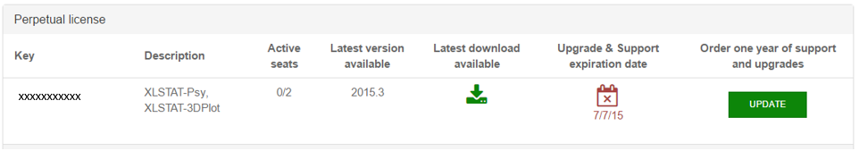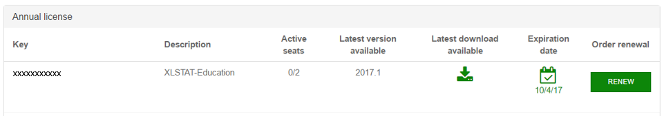 All the licenses linked to your account are listed on your MyXLSTAT page. For each, you have the possibility to: