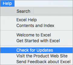 To update Excel 2016, click on Check for Updates, which is located in the Help menu of your menu bar. A dialog window appears.