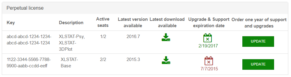 The status of all your licenses is visible on your account page, My XLSTAT. From this page you can check the expiration date of your annual licenses or perpetual licenses' upgrade & support period.