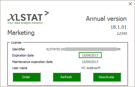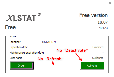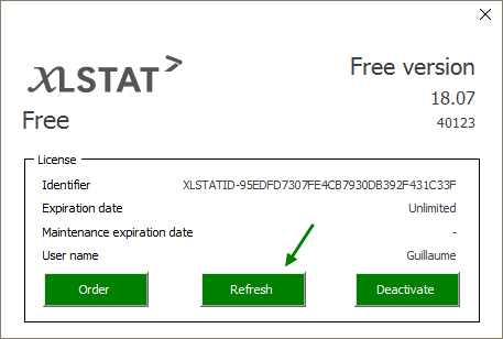 On the About XLSTAT window, there is no Refresh nor Deactivate button (picture below). You are likely updating from an old XLSTAT version. If this is your case, please follow the following guide in order to activate your license:
