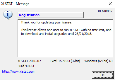 Once the update or renewal purchased, you should receive an email from sales@xlstat.com. At this point you can visit again the MyXLSTAT page to download again the latest version of XLSTAT. The Activating or updating your license section below will help you with activating your new annual license or updating your perpetual license.