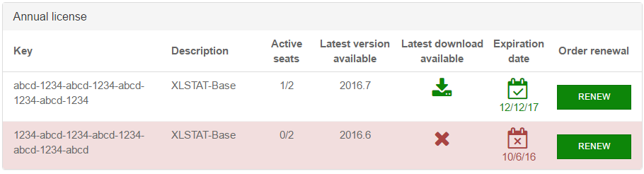 For an annual license, a line with a red background indicates an expired license. When valid, you have the possibility to download the latest XLSTAT version from that location.