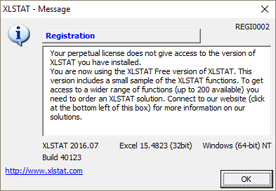After launching XLSTAT, a popup appeared indicating that your perpetual license does not give you access to this XLSTAT version (picture 1). If this is your case, and/or if a Refresh button is available on the About XLSTAT (picture 2), please click on it in order to refresh your license. Your license should then be updated and XLSTAT ready to be used again (picture 3).