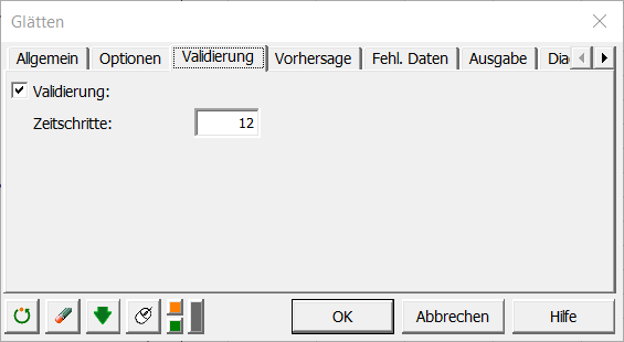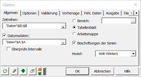 Geben Sie zuletzt in der Registerkarte Validierung 12 ein, sodass die letzten 12 Werte nicht zur Anpassung des Modells sondern nur zur Validierung des Modells verwendet werden.