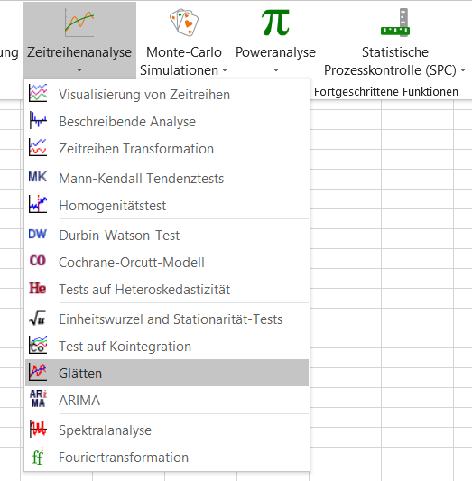 Nach dem Öffnen von XLSTAT wählen Sie den Befehl XLSTAT/Zeit/Glätten.