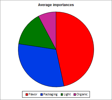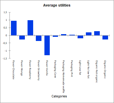 heir averages are calculated and displayed on charts. These give an idea of the importance of each factor. We can conclude that flavor and packaging are the most important factors both at the individual level and the average level. More specifically, chocolate or raspberry flavor and homemade waffle packaging have a largely positive effect (average utilities graph). XLSTAT-Conjoint allows to segment respondents by using statistical clustering methods. This option allows to see if homogeneous groups of individuals emerge.