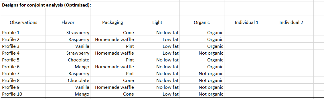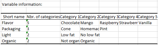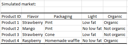 The first step is the choice of important characteristics that define an ice cream. This is done in collaboration with experts in the ice cream market. The selected factors are : 1. Flavor (Raspberry, Mango, Strawberry, Vanilla, Chocolate) 2. Packaging (Cone, Homemade waffle, Pint) 3. Is the ice cream Low fat (Low fat, Not low fat)? 4. Is the ice cream organic (Not organic, Organic)?