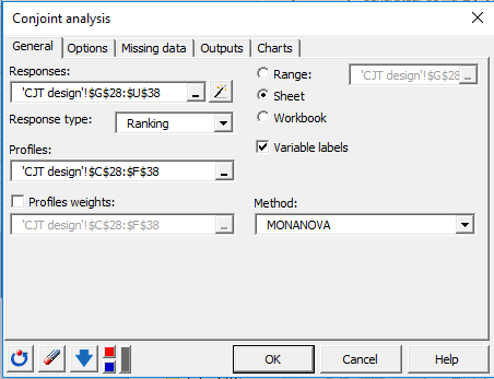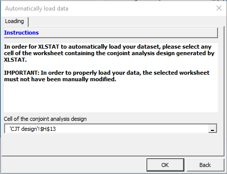 Alternatively, you can click on CJT / Conjoint analysis. To facilitate data selection and avoid to manually select the two required datasets (Responses and Profiles), you can click on the magic stick. This will automatically load the two datasets if the conjoint design has been generated with XLSTAT and if the results sheet has not been manually modified (addition of rows or columns…). A new window will pop up. Select any cell of the sheet containing the design for conjoint analysis. In this example, we selected the cell H13 of the CJT Design sheet. Then click OK. You can also select your data manually. In the Responses field, select the 15 columns of the conjoint design corresponding to the individuals' rankings (right part of the table). In the Profiles field, select the columns associated with the different profiles (excluding the profile names). Choose the ranking option as response type. Once you click on the OK button, the computations are performed and the results are displayed.
