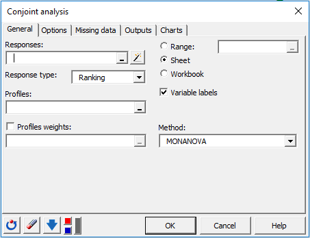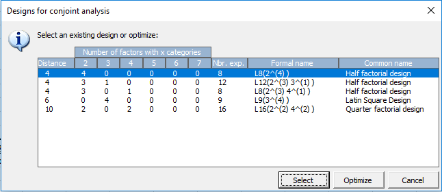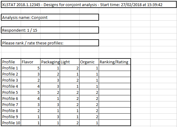 XLSTAT-Conjoint analysis uses experimental designs to select a number of profiles and allow interviewed people to make their rankings.