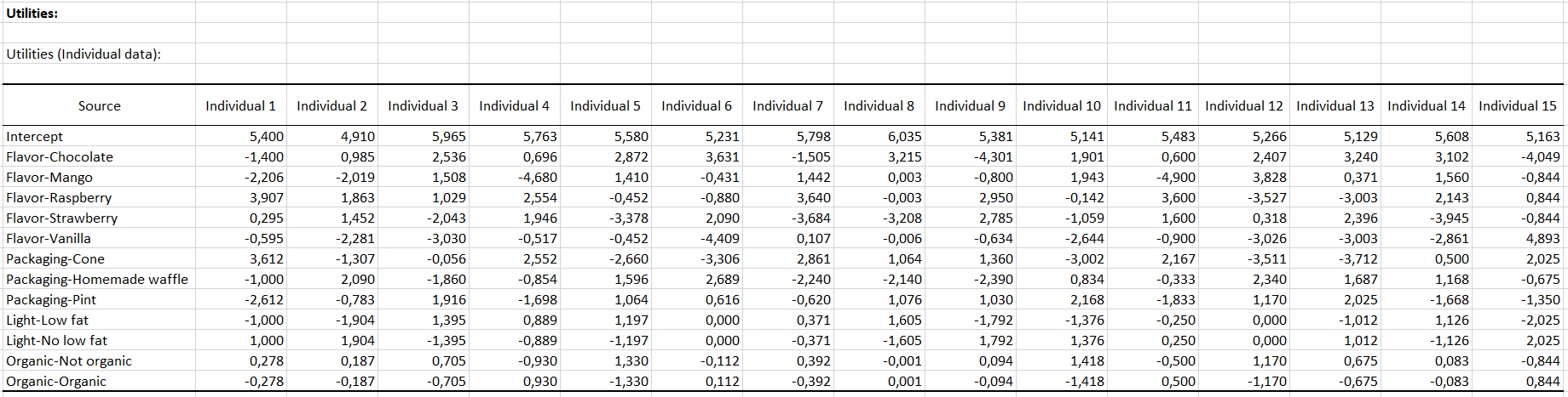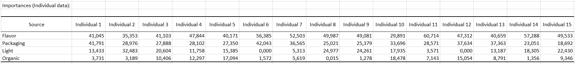 The most important results are the partial utilities as well as the individual importances. These are calculated at an individual level. They can be found in the below tables.