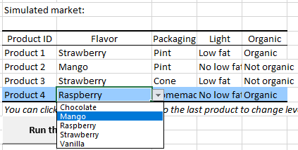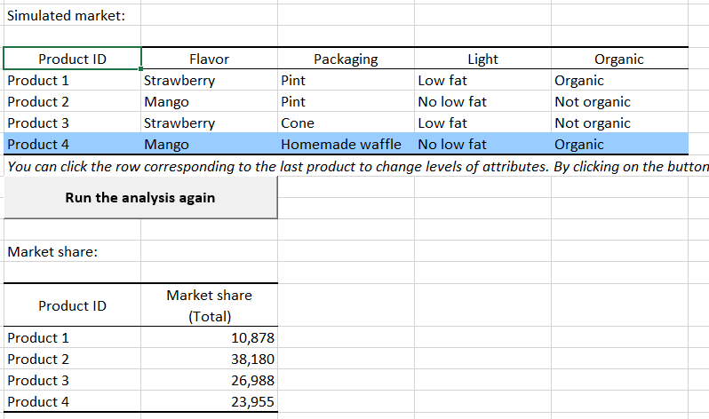 In this example, we will study a classic case of conjoint analysis: how to introduce a new product in a competitive market. More specifically, an ice cream shop wants to introduce a new ice cream. The conjoint analysis will be used to answer the following questions: what are the characteristics that the ice cream should have in order to, first, please the greatest number of people, and, second, gain market shares in an already competitive market?