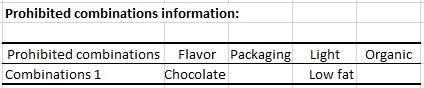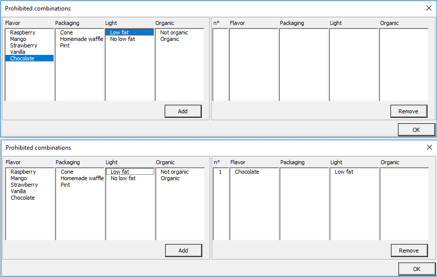 Launch XLSTAT and select the Designs for conjoint analysis function: A dialog box will then appear. You can now enter the name of your analysis, select the Factors/Categories table and the number of profiles to be generated (10). In the Options tab, we check the option prohibited combinations in order to exclude some combinations of modalities from the survey. In the Output tab, individual sheets are not activated since the use of these sheets is not necessary for the tutorial. In a comprehensive analysis though, they can be very useful in order to get the responses filled directly by respondents. Once you click on OK, a first dialog box appears asking for the selection of prohibited combinations. We choose here to prohibit the chocolate flavor with the type of lightened ice. For that we select chocolate and low fat in the left part of the interface, then click on Add, and finally on OK. The next widows appears which allows you n case we do not select prohibited combinations, another dialog box appears. This allows you to select a specific fractional factorial design or to optimize the design (D-optimal). Here, we used the optimize option. Here, with prohibited combinations, the optimize option is automatic.