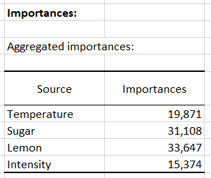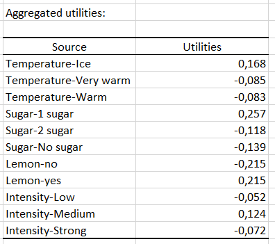 This shows that the sugar and the intensity factors are the most important factors in the analysis with an importance of more than 33%. In the aggregated utilities table, we see that the lack of sugar has a negative effect on choice.