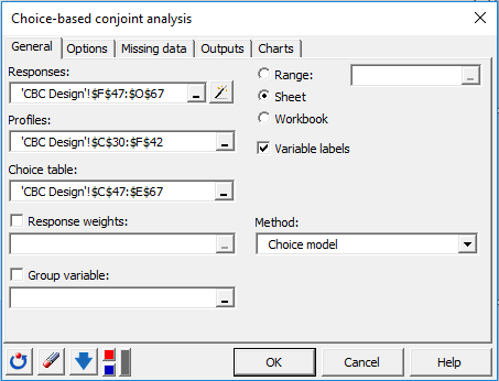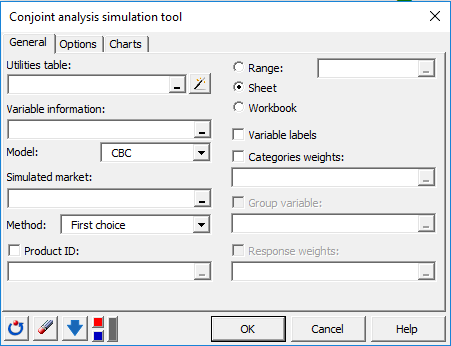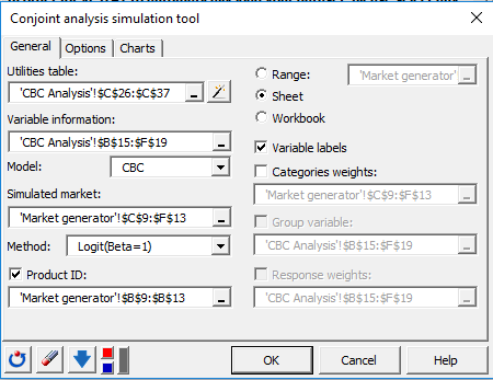 You can also select your data manually: Utilities can be found in the CBC Analysis sheet; the table of information about variables is obtained in the CBC analysis sheet. The simulated market is in the Market generator sheet (do not select the names of products). You can also select the name of the product just behind the Product ID button. Select the Full profile model and the logit method for simulation.