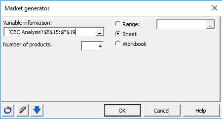 In order to generate the market table containing the different products, you have to select the Variable information table which is on the results sheet of your conjoint analysis. You also have to indicate the number of products you want to generate. Then click on OK.