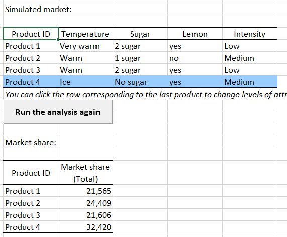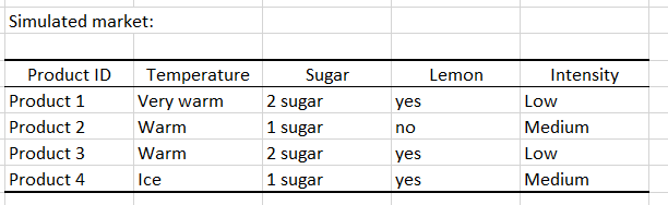 In our case, the market for a tea-based beverage is analyzed and we would like to investigate the impact and market shares the introduction of a new product would have. This product (Product 4) is a medium very warm tea without lemon and 1 sugar. We know that in today's market there are 3 tea-based beverages that have different characteristics. The following table shows the simulated market: