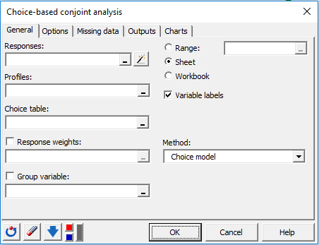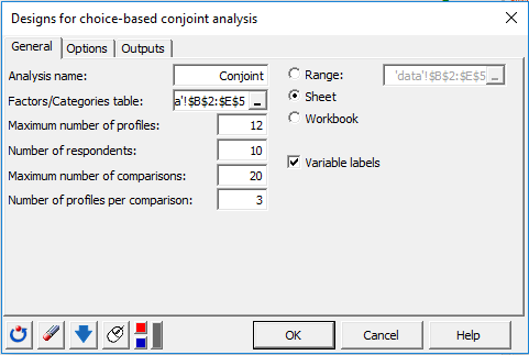 Once XLSTAT is started, click on the CJT icon and choose the function Design for choice-based conjoint analysis.