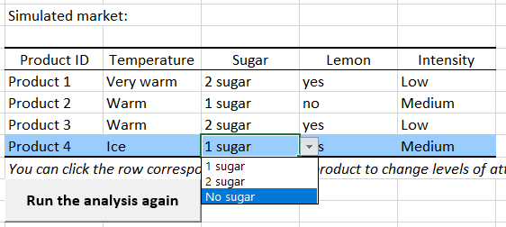 In order to quickly evaluate the impact of other changing on the new product (you may want to know what would be the market share if there is no sugar in the product), you can modify the categories of the last product (blue row) in the Simulated market table by clicking on the categories you want to change.